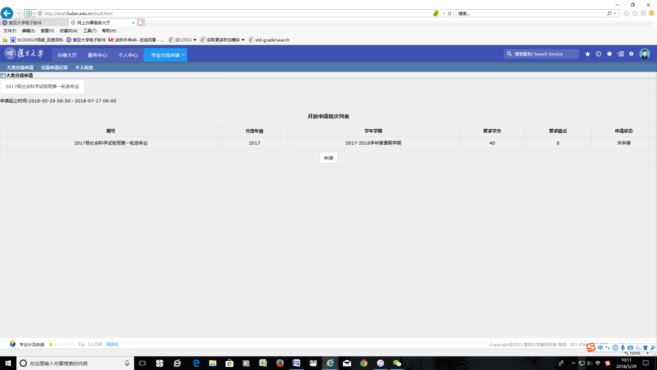 (一)各试验班学生须在上述指定时间内登录网上办事服务大厅(http://ehall.fudan.edu.cn/),搜索“专业分流”,点击进入服务,选择相应的专业进行志愿填报,并填写报名信息(建议使用IE11、Firefox或Chrome浏览器报名);学生在填写完专业志愿后,请务必注意点击“提交”按钮。未在指定内时间报名者,不能获得相应轮次的专业分流录取。