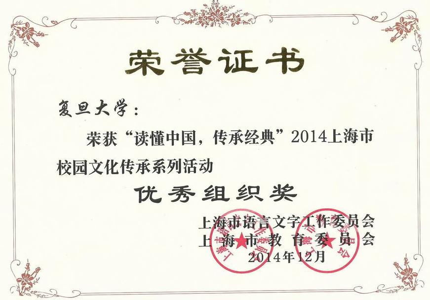 我校语委办与区县语委办联合举办经典诵读活动,大学生、中学生同台竞技的创新做法亦得到了市教委、市语委的肯定,我校获评“读懂中国,传承经典”2014上海市师生经典诵读活动优秀组织奖。
