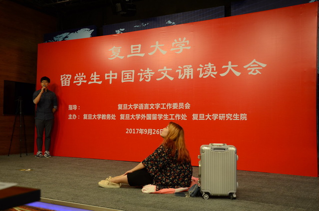下午2时,诵读大会正式开始,校语委办主任、教务处副处长应质峰向参赛选手及评委、嘉宾致辞。来自《雅言》编辑部的王羿人(中国籍)和来自新闻学院的陈晓绢代(日本籍)担任主持人。诵读大会个人组参赛选手和集体组参赛选手交替登台演出,选手们或吟诵诗词,或穿插表演,共同演绎不同风格的中国经典诗歌文化。选手们诵读的作品有《乡愁》《关山月》《致橡树》《水调歌头》《匆匆》等脍炙人口的名篇佳作。