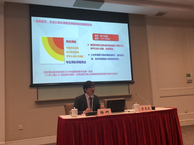 教育部思政理论课教学指导委员会副主任、上海市人大外事委员会主任委员、侨务民族宗教委员会主任委员高德毅教授为与会学员作了“从思政课程拓展到课程思政——全面构建高校思想政治教育课程体系”的报告。他指出,要从战略高度构建思想政治教育课程体系,实现教书育人相统一,并从德育创新的总体思路、战略选择、实现途径等各方面阐述了对课程思政教育教学改革的深入思考。