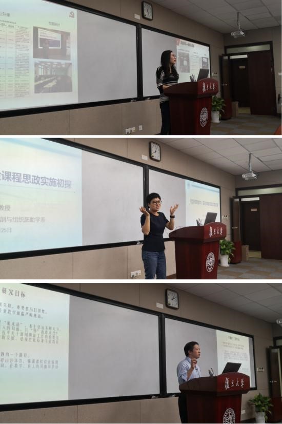 郭翌老师首先介绍了信息学院课程思政工作推进情况和“1+2+15”新工科专业思政体系,紧抓上海市课程思政领航学院的发展机遇,建设2个上海市课程思政领航团队、15门上海市领航课程。在这一背景下,郭老师以问题为导向,围绕教师认同感、课堂内容设计、评价体系三部分内容展开课题研究,积极探索具有复旦特色的、与思想政治教育有机融合的新工科教育模式。刘琼老师以“《组织胚胎学》实验课程思政实施初探”为题,以《组织胚胎学》实验课为切入点,梳理医学专业课程上出“思政味道”的有效途径。依托讲座、讨论等活动形式,创新教学方法,将一张张组织学切片背后所承载的复旦前辈事迹及学科发展历史融入课堂,将医学人文精神、科学精神、职业素养与大医精诚的医学精神贯穿整个课程之中。定期开展问卷调查,密切追踪并不断调试课堂成效,做到育人功能与专业知识互为表里、交织交融。杨鹏老师以“新闻与传播学课程思政效果研究”为题,介绍了选题由来与研究目标、研究内容与总体方案以及目前的进展情况。杨老师指出新闻学专业教学在媒体变革进程中面临着严峻的挑战,课程思政是应对挑战、解决难题的一个重要路径,强调习近平关于新闻舆论工作的重要论述精神是马克思主义新闻观在当今中国的新发展,必须依此校准专业教育的大方向。