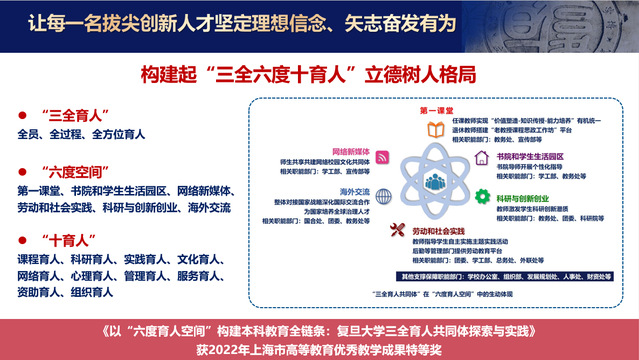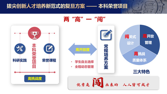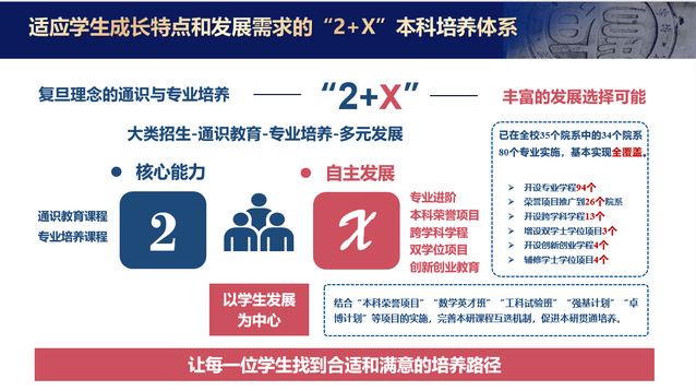 l在人才培养改革创新的探索上,构建起“三全六度十育人”立德树人格局,让每一名拔尖创新人才坚定理想信念、矢志奋发有为;以学生发展为中心,打造“2+X”本科培养体系,让每一位学生找到合适和满意的培养路径;秉承优秀是“闯”出来的,人人皆可成才的理念,打造本科荣誉项目,提出拔尖创新人才培养新范式的复旦方案。