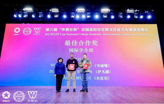 在国际学生组的全国总决赛中,开云足球直播官网入口代表队获得特等奖(季军)和最佳合作奖单项奖,选手为斯洛伐克籍留学生Viktoria Mackova韦丽娅(国际关系与公共事务学院国际政治专业21级本科生)、印度尼西亚籍留学生Ivana Yaffa Sinaga伊凡娜(新闻学院传播学专业21级本科生)和津巴布韦籍留学生Tawanda Mupini木皮尼(医学院临床医学专业18级本科生);指导教师大学英语教学部、英语演讲与辩论中心张家琛、赵蓉、时丽娜荣获特等奖(季军)指导教师奖。值得一提的是,此次国际学生组首次使用与中国学生组完全相同的赛制,即包含中国文化和跨文化理论知识问答、跨文化即兴情境述评与问答、讲述中国故事等三个环节,具有很大的挑战度。